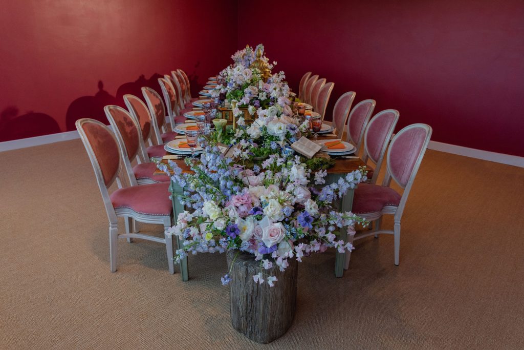 To transform the tablescape into an unforgettable masterpiece fit for a luxurious luncheon, we collaborated with the renowned luxury furniture and tableware supplier, Options Greathire. Their exceptional offerings became our canvas, starting with their exquisite Willow dining tables in a soft, sage hue, a sophisticated base that perfectly complemented the spring aesthetic. To elevate the setting even further, we chose their stunning Chandelle chairs in plush pink velvet, a combination of comfort and opulence that added a tactile sense of indulgence.